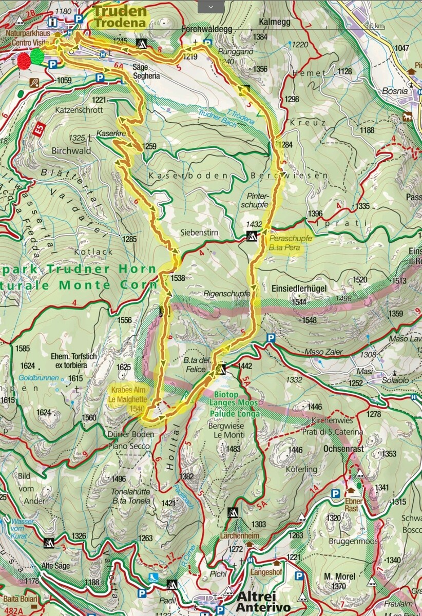 Nel centro di Trodena (1127m), poco sotto la caratteristica chiesetta dall’immancabile tetto spiovente imbocchiamo la via della vecchia segheria, una strada in discesa che al di là del ponte sul torrente abbandoniamo per deviare a sinistra sul segnavia 6 per Anterivo, altro comune compreso nel parco naturale del Monte Corno. Su per il viottolo acciottolato ci avviamo così in uno slalom tra alti fusti d’abete e pietre ammantate di muschio, l’habitat ideale per fiori e funghi che con il loro profumo riempiono l’aria e inebriano tutti i sensi, mentre intersecando più volte il tracciato della forestale e senza lasciarci distrarre dalla trasversale sterrata del segnavia 4 (ore2), dritti su a monte superiamo una zona paludosa prima di sbucare più in alto ancora nella solare radura delle Malghette (1540m, 25min), una pittoresca malga appollaiata su un erboso dosso che rappresenta la massima elevazione del giorno. Dopo l’irrinunciabile sosta, salutati dal starnazzare di galline e anatre ci abbassiamo di quota seguendo il sentiero che tra i lussureggianti pascoli va a intercettare più in basso la stradina sterrata che costeggia stavolta la torbiera di Palù Longa (1460m, 15min), prezioso biotopo questo ricco di piante acquatiche, dove tra danzare di libellule e frinire di cicale si respira aria d’estate. Raggiunto così l’ennesimo bivio, con direzione prevalentemente nord a sinistra deviamo ora sul segnavia 5, altra comoda forestale che qui chiamano “mulattiera”, e che al di là di un cancello in legno scompare nuovamente nel folto bosco. Nel gioco di luci e ombre che animano il sottobosco, ci ritroviamo così ad attraversare zone paludose scavalcate da passerelle e lussureggianti radure punteggiate di mille fiori, un suggestivo ambiente dove la natura è protagonista assoluta, e dove seguendo i lievi saliscendi del sentiero nel frattempo incrociamo nuovamente la trasversale sterrata del segnavia 4, prima di passare sul bordo del laghetto che anticipa la radura di baita Pera (1432m, 50min), una solitaria casupola in pietra che lì nel bel mezzo del bosco appare come un sogno. Senza mai perdere di vista i preziosi segnavia bianco-rossi del numero 5, seguendo l’evidente traccia che nel fitto sottobosco passa nel frattempo dinnanzi alle tipiche baite in legno di “Pinter-Schupfs”, ecco che più avanti ancora ci sorprendiamo ad ammirare il candore dei fiori di lotto che lì sulle tranquille acque di un’ultimo stagno galleggiano come tante barchette, un’incantevole immagine che sembra trascendere direttamente da un altro mondo.