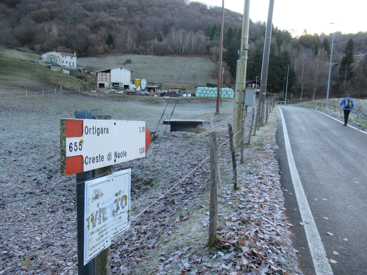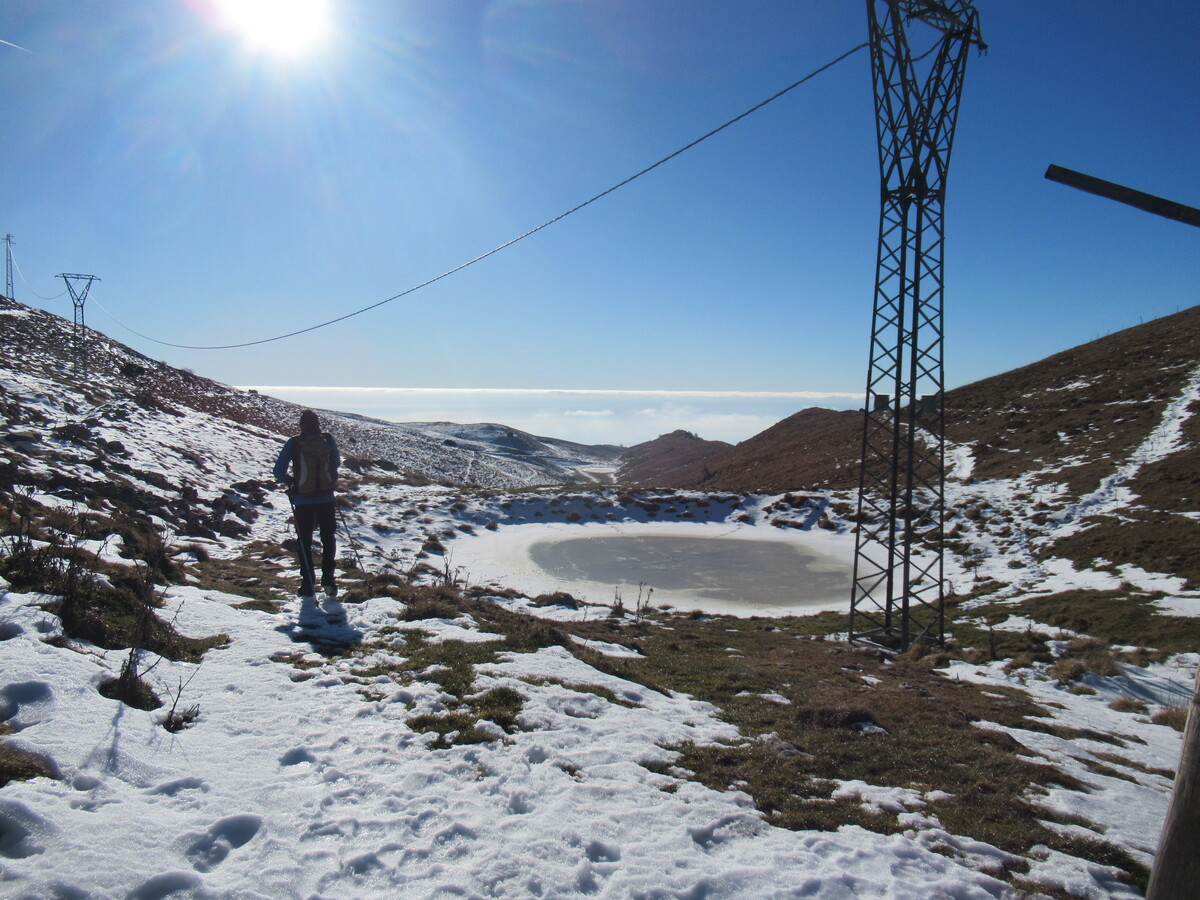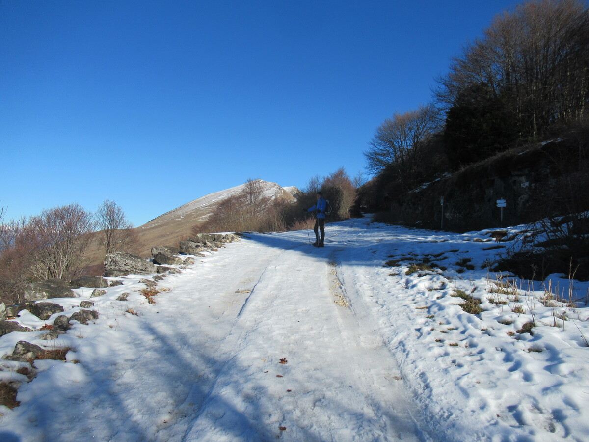 In quel di Prada (1000m), al canto del gallo la giornata inizia subito in salita salendo su per la Val del Sacco, una via asfaltata che parallela al torrente passa dinnanzi ad alcune abitazioni, prima di cedere il passo allo sterrato e proseguire nell’ombra dei scheletrici faggi fin al primo bivio del giorno (1170m, 30min). Tralasciando per ora il sentiero che sarà poi il nostro rientro, al di là della sbarra che sta alla nostra sinistra proseguiamo sul 655, stesso segnavia fin qui seguito che tra macchie boscate e radure continua a salire verso monte fin ad intercettare una prima volta la forestale che arriva dal parcheggio “Due Pozze”, un incrocio che ignoriamo per proseguire sul sentiero che sempre nel bosco la va’ a intercettare una seconda volta più in alto in prossimità di malga Ortigara (1400m, 40min), una stalla con tanto di casara che anticipa di poco il nostro arrivo alla storica chiesetta della Madonna della Neve (1438m, 10min). Sempre in moderata salita riprendiamo il sentiero che tra i pascoli a monte passa al di sopra di una pozza d’acqua, prima di scomparire nuovamente nella fascia boscata e arrancare sul sentiero che poco più in alto va a intercettare la vecchia strada militare che sale dalle Due Pozze (1550m, 20min), un insidioso nastro tutto ghiacciato che oggi richiede attenzione e l’uso dei ramponi, mentre sempre ben affacciati sul Garda e con i rifugi Chierego e Fiori del Baldo ormai ben in vista, strada facendo abbandoniamo il lungo traversone per inerpicarci direttamente alla nostra destra sulla traccia che rimonta in groppa all’affilata cresta di Costabella (1686m, 40min). Raggiunta così la quota più alta e panoramica dell’intera giornata, con il Garda e i suoi monti da un lato e la Lessinia con il Carega dall’altro caliamo giù dall’opposto versante fin al sottostante bivio con il sentiero “Ottaviani” (10min), dove interrompendo la discesa a destra imbocchiamo la splendida e recondita Val di Naole. Con il sole in fronte e l’erba ghiacciata che a ogni passo scricchiola sotto i piedi, mantenendoci sul fondo valle tiriamo dritti fin a sfiorare più a sud il bordo di una pozza ghiacciata, prima di prendere la sterrata che s’innalza sulla cresta alla nostra destra, una via d’uscita dalla val di Naole che al di là del crinale va’ a intercettare nuovamente la vecchia strada militare già risalita all’andata (1550m, 30min). Riaffacciandoci così sul lago e tralasciando il sentiero che cala giù alla Madonna della Neve, dritti a sud stavolta seguiamo integralmente la sterrata che nel bosco continua a calare di quota, una lunga e agevole discesa dove tra patriarcali faggi e verdi chiome d’abeti, ecco che nel frattempo, proprio lì all’incrocio per malga Ortigara entra in scena un simpatico cagnolino, un vivace esemplare di cane da tartufo che con tutta la soddisfazione di chi ha scovato il suo tesoro ci accompagna con il suo padrone al seguito fin giù nel piazzale delle “Due Pozze” (1282m, 50min), ultimo parcheggio utile questo per chi da Prada sale fin quassù con la macchina.