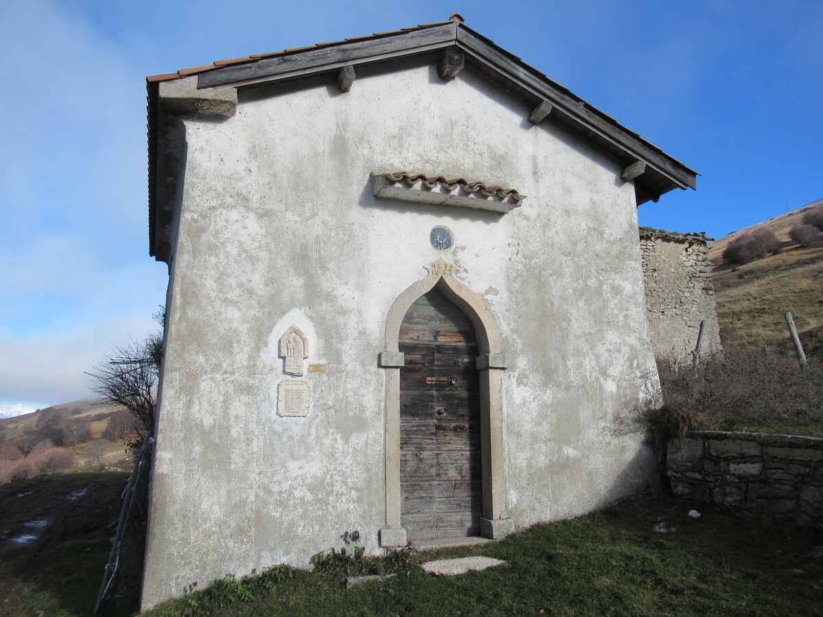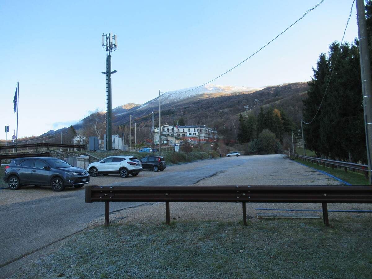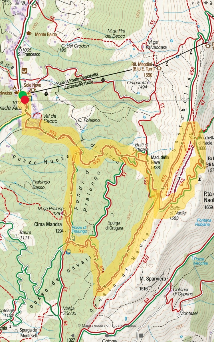 In quel di Prada (1000m), al canto del gallo la giornata inizia subito in salita salendo su per la Val del Sacco, una via asfaltata che parallela al torrente passa dinnanzi ad alcune abitazioni, prima di cedere il passo allo sterrato e proseguire nell’ombra dei scheletrici faggi fin al primo bivio del giorno (1170m, 30min). Tralasciando per ora il sentiero che sarà poi il nostro rientro, al di là della sbarra che sta alla nostra sinistra proseguiamo sul 655, stesso segnavia fin qui seguito che tra macchie boscate e radure continua a salire verso monte fin ad intercettare una prima volta la forestale che arriva dal parcheggio “Due Pozze”, un incrocio che ignoriamo per proseguire sul sentiero che sempre nel bosco la va’ a intercettare una seconda volta più in alto in prossimità di malga Ortigara (1400m, 40min), una stalla con tanto di casara che anticipa di poco il nostro arrivo alla storica chiesetta della Madonna della Neve (1438m, 10min). Sempre in moderata salita riprendiamo il sentiero che tra i pascoli a monte passa al di sopra di una pozza d’acqua, prima di scomparire nuovamente nella fascia boscata e arrancare sul sentiero che poco più in alto va a intercettare la vecchia strada militare che sale dalle Due Pozze (1550m, 20min), un insidioso nastro tutto ghiacciato che oggi richiede attenzione e l’uso dei ramponi, mentre sempre ben affacciati sul Garda e con i rifugi Chierego e Fiori del Baldo ormai ben in vista, strada facendo abbandoniamo il lungo traversone per inerpicarci direttamente alla nostra destra sulla traccia che rimonta in groppa all’affilata cresta di Costabella (1686m, 40min). Raggiunta così la quota più alta e panoramica dell’intera giornata, con il Garda e i suoi monti da un lato e la Lessinia con il Carega dall’altro caliamo giù dall’opposto versante fin al sottostante bivio con il sentiero “Ottaviani” (10min), dove interrompendo la discesa a destra imbocchiamo la splendida e recondita Val di Naole. Con il sole in fronte e l’erba ghiacciata che a ogni passo scricchiola sotto i piedi, mantenendoci sul fondo valle tiriamo dritti fin a sfiorare più a sud il bordo di una pozza ghiacciata, prima di prendere la sterrata che s’innalza sulla cresta alla nostra destra, una via d’uscita dalla val di Naole che al di là del crinale va’ a intercettare nuovamente la vecchia strada militare già risalita all’andata (1550m, 30min). Riaffacciandoci così sul lago e tralasciando il sentiero che cala giù alla Madonna della Neve, dritti a sud stavolta seguiamo integralmente la sterrata che nel bosco continua a calare di quota, una lunga e agevole discesa dove tra patriarcali faggi e verdi chiome d’abeti, ecco che nel frattempo, proprio lì all’incrocio per malga Ortigara entra in scena un simpatico cagnolino, un vivace esemplare di cane da tartufo che con tutta la soddisfazione di chi ha scovato il suo tesoro ci accompagna con il suo padrone al seguito fin giù nel piazzale delle “Due Pozze” (1282m, 50min), ultimo parcheggio utile questo per chi da Prada sale fin quassù con la macchina.