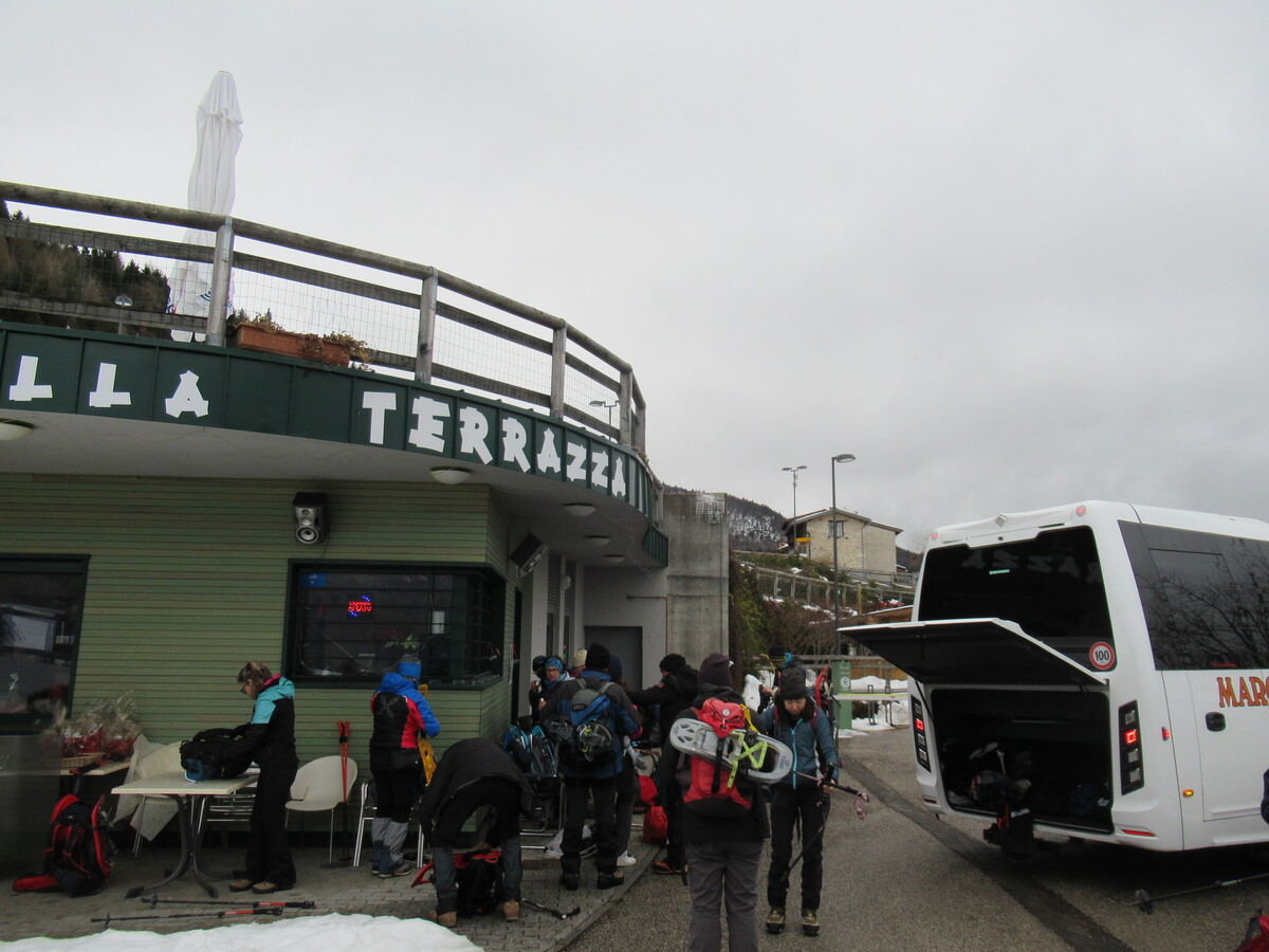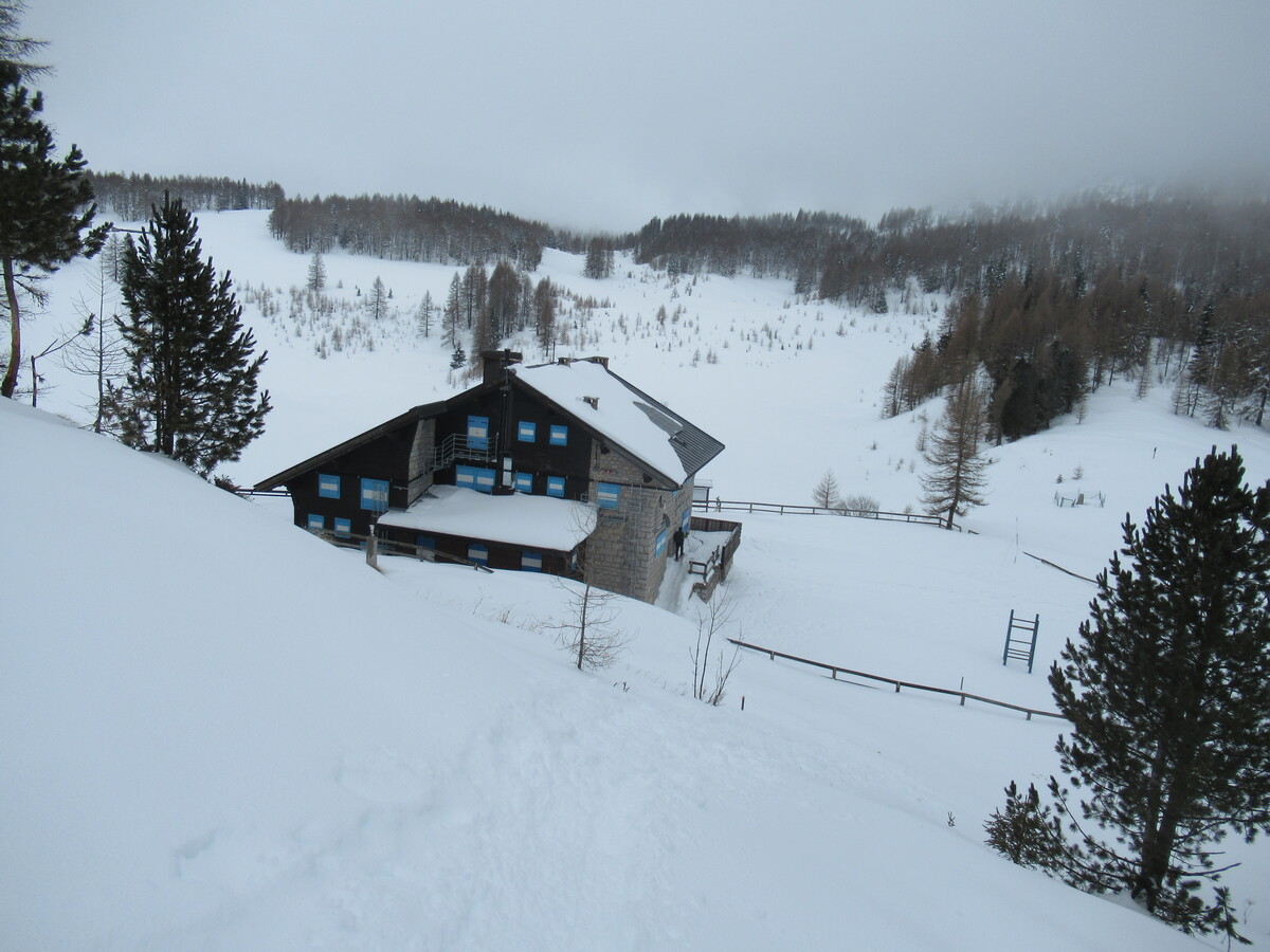 In quel di Giazzera (1092m) proprio nel piazzale antistante il bar “La Terrazza” iniziamo risalendo su per la viuzza tutta innevata che nella parte alta del borgo s’innalza velocemente al di sopra dei tetti delle case, un bel modo per rompere il fiato e infilare il sentiero che su per il bosco va a intercettare più sopra ancora la strada principale per la piana del Chèserle e l’Alpe Pozza (1240, 20min). Proseguendo così per un breve tratto lungo la stessa strada che sarà poi il nostro rientro, ecco che sulla sinistra deviamo ora sul sentiero 132 delle “Hull”, un brusco cambio di pendenza e una dura prova per fiato e gambe che tra neve e ghiaccio termina su in alto tra i prati del monte Pazul (1416m, 40min), una radura libera da ostacoli dove purtroppo oggi non si riesce a vedere né il fondo della Vallarsa e tanto meno l’interminabile distesa di creste e cime che nei giorni migliori disegnano l’orizzonte al di là della Val d’Adige. Nebbia o no, poco sotto il cucuzzolo del Pazul arriva il momento di calzare le ciaspole, un accessorio necessario per proseguire a destra sul soffice manto che copre la stradina forestale, una dolce ma costante salita tra radi larici e betulle che più avanti sfocia nella candida spianata che circonda il Bàit dei Rossi, un paesaggio onirico di neve e nebbia dove si ha l’impressione di camminare tra le pagine di un vecchio album di foto in bianco e nero, e dove lì accanto alla propria baita una pittoresca coppia di contadini armati di falce e rastrello se ne stanno imperterriti a sorvegliare il bivio per malga Valli (1557m, 20min). Giusto il tempo di ricompattare la numerosa compagnia, e poco sotto il Bàito della Marisa tiriamo dritti sull’indicazione per il rifugio Lancia, un tratto in salita lungo l’ampia dorsale che a ridosso del Dos dell’Anziana s’innalza su per un rado boschetto, prima di puntare dritti verso il Col Santo, o meglio l’ombra del monte che là dinnanzi traspare appena nella pallida luce del sole invernale, un’atmosfera surreale dove d’improvviso ogni traccia e ogni punto di riferimento scompare, lasciandoci lì nel bel mezzo del nulla a cercare la giusta via per il Lancia. Una ciacola tira l’altra, ed ecco unirsi alla compagnia le quattro escursioniste che con tanto di cani al seguito finora hanno ricalcato la nostre stesse orme, l’occasione giusta per fare il punto della situazione, mentre a dissolvere ogni dubbio ecco apparire nella nebbia un solitario abete, un sicuro punto di riferimento che non è sfuggito alle nostre nuove compagne di viaggio, le quali senza indugio sono pronte a portarsi in testa al gruppo e aprire il solco che porta dritti al cuore dell’Alpe Alba (1837m, ore1:40), altra immacolata conca punteggiata da pittoresche casupole dove finalmente riappaiono nuovamente i colori bianco-rossi dei segnavia, un chiaro invito a proseguire nella successiva macchia boscata prima d’arrivare sulla cengia che s’affaccia sull’Alpe Pozza, passaggio un po' delicato questo che richiede attenzione, prima d’imboccare il scosceso canalino che tra le rocce scivola fin giù alla bella chiesetta alpina del rifugio Vincenzo Lancia (1825m, 30min).