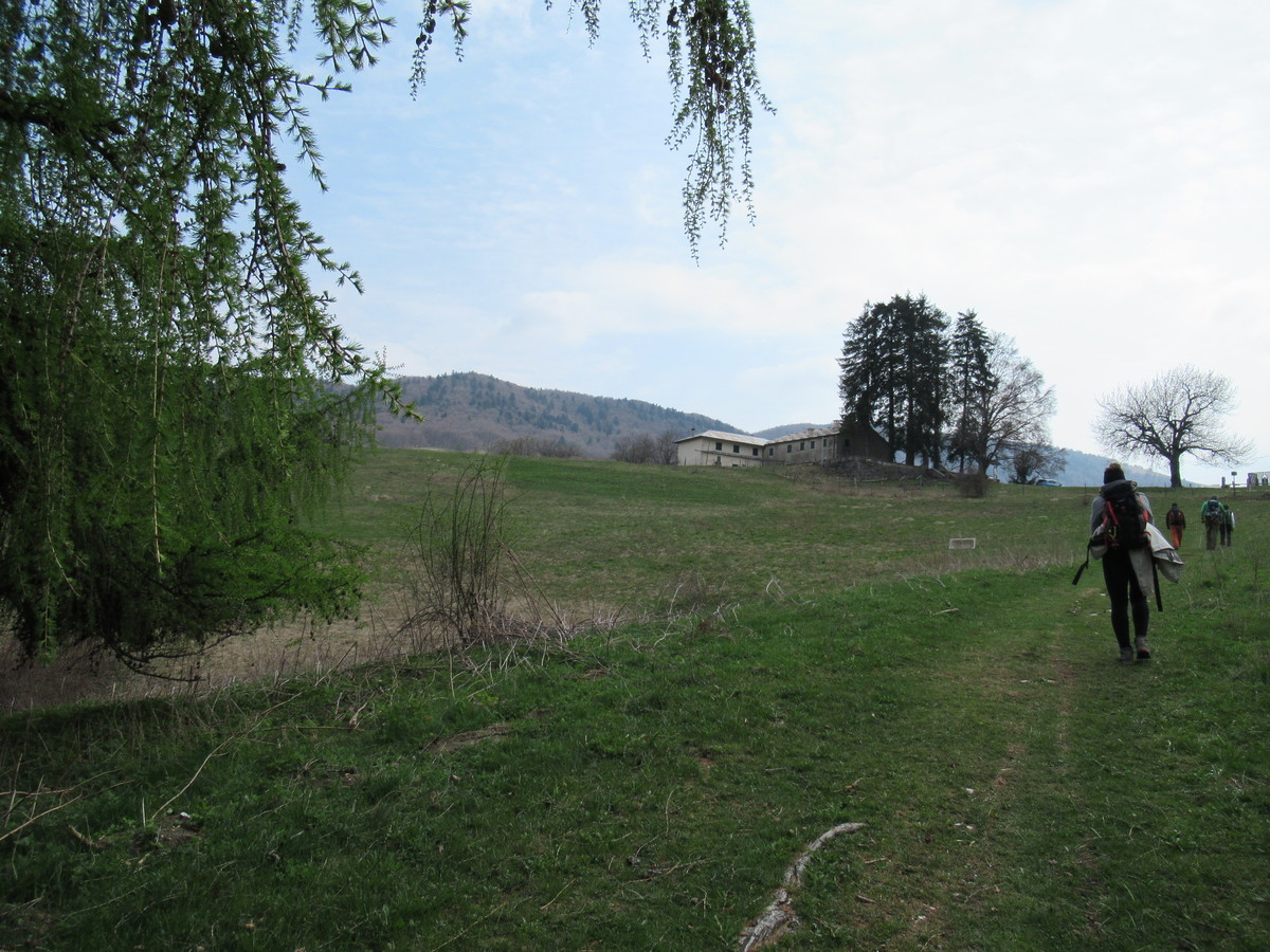 Consumato il nostro fugale spuntino, non rimane che ricalcare in discesa alla nostra sinistra la comoda forestale che a nord perviene dal passo "Pozza della Cola", e su segnavia 653, camminando a margine dei pascoli e transitando strada facendo dinnanzi a graziosi villini e fienili, ecco che attraversato più in basso il ponticello sul torrente della Val dei Rii e affrontato sul lato opposto un’ultimo cambio di pendenza, su in alto chiudiamo il nostro periplo davanti alla storica chiesetta della Madonna della Neve (30min.).