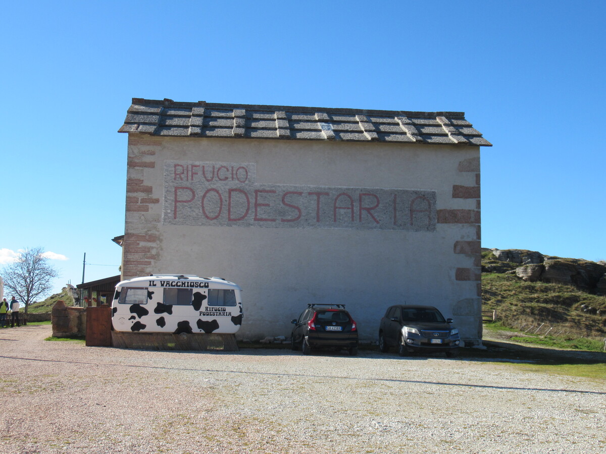 Tralasciando per ora l’indicazione 255 per Podestaria, a Bocca di Selva (1551m) imbocchiamo la forestale che ai piedi del monte Tomba devia a sinistra verso malga Folignano di Sotto (1490m, 20min) e prosegue poi per l’omonima di Fondo (1472m, 10min), due caratteristiche costruzioni in pietra della zona che ben si integrano nell’ambiente che le circonda. Lasciandoci così alle spalle anche quest’ultima malga e la sua setosa prateria, in costante e sempre più scoscesa discesa proseguiamo sulla stradina che s’inoltra nella foresta dei Folignani, una delle zone più selvagge della Lessinia dove da quel che si dice anche i lupi hanno messo su famiglia, e dove accompagnati dalla strana sensazione di non essere mai soli, andiamo a incrociare più in basso il trasversale sentiero 256 che qui risale dal Vajo dell’Anguilla (1372m,15min). Con il scricchiolio di foglie morte e ghiacciate che ritma ogni passo, alla nostra destra seguiamo l’indicazione per Podestaria, un suggestivo sentiero tra felci e pietre ammantate di muschio che si mantiene sul fondo dell’ombroso impluvio, prima d’iniziare ad arrampicare su per il tratto finale dell’attiguo Vajo delle Ortighe e riemergere così tra i pascoli dell’ondulato altopiano, dove lì a sinistra, passando sul bordo della pozza d’acqua di casara Gasparini diventa facile raggiungere il rifugio di Podestaria (1655m, 50min). Giusto il tempo per qualche foto e scambiare quattro ciacole con il gestore del rifugio, e lì difronte andiamo a intercettare la strada principale dell’alta dorsale della Lessinia, una pianeggiante sterrata che alla nostra destra seguiamo fin al bivio per Bocca di Selva, altra stradina questa che d’inverno diventa una pista da scii, e che da lì a poco abbandoniamo per arrampicare dritti alla nostra sinistra fin sulla cima del Tomba (1766m, 40min), un solitario cucuzzolo dove dal Baldo al Carega e a seguire le Piccole Dolomiti Vicentine, ben oltre la pianura a sud ecco apparire la contorta dorsale Appenninica, un intero angolo giro che si conclude sul basso Garda con Sirmione in bella vista.