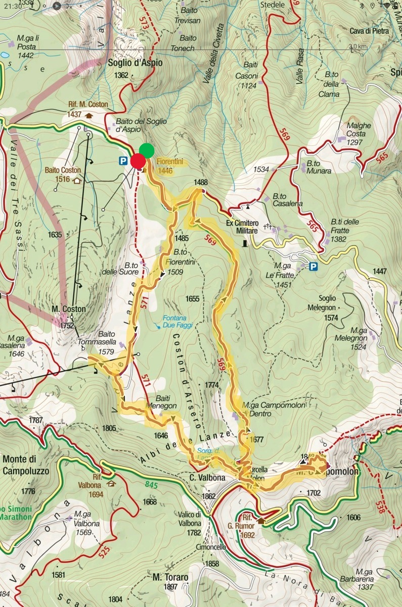 Concluso così il breve periplo sul cucuzzolo del Campomolon, con il monte Toraro alle spalle torniamo sui nostri passi fin alla vicina sella, dove al sentiero che risale dalla Val delle Lanze stavolta preferiamo il segnavia 569. Un ritorno tutto in discesa lungo la stradina forestale che mantenendosi sul versante orientale del Coston d’Arsiero passa nel frattempo dinnanzi a malga Campomolon di Dentro, prima di proseguire nel bosco e andar a intercettare giù in basso la provinciale dei Fiorentini (1488m, ore1), lo stesso nastro d’asfalto del mattino che a ritroso porta dritti al parcheggio di partenza (15min).